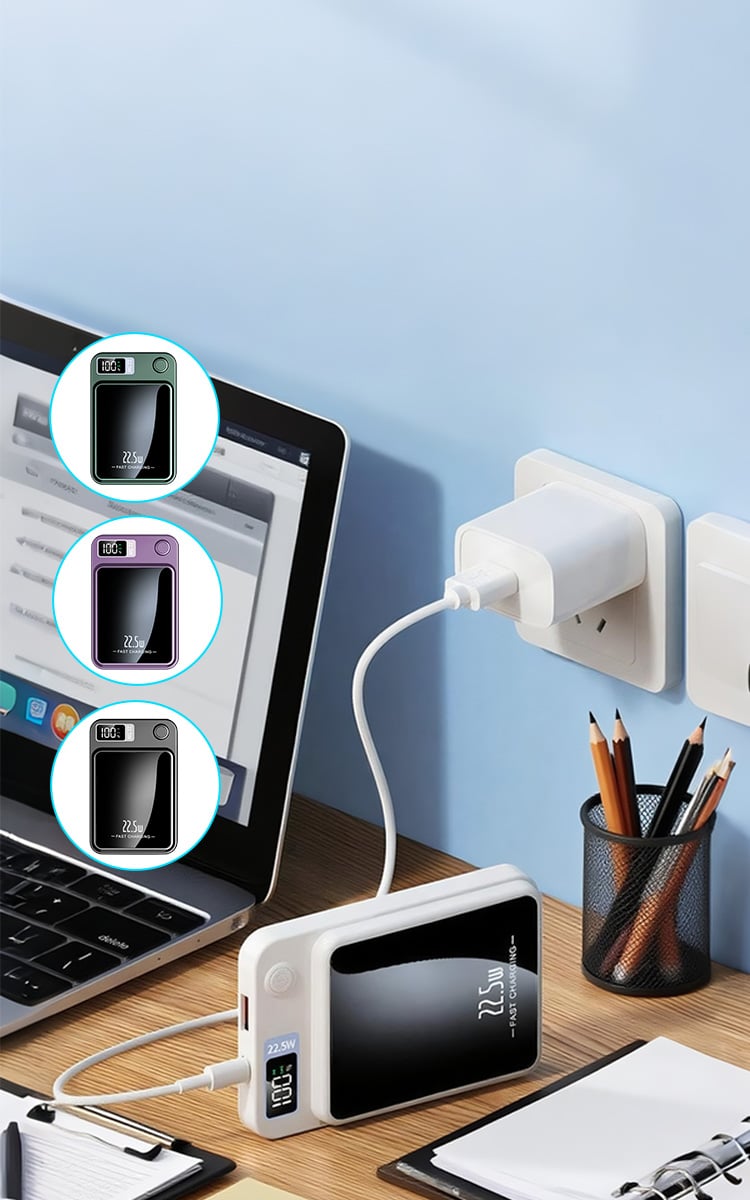 S: Ikke i det hele tatt. Med 5,000 mAh kapasitet og bare omtrent 250g, er den slank og lettvektig — perfekt for pendling, reise eller daglig bruk.